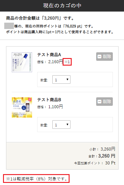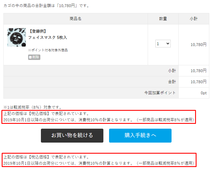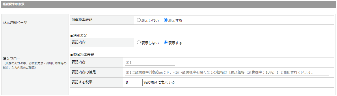 | 表記内容 | 購入フローの軽減税率対象商品に表示する注記を設定します。 |
