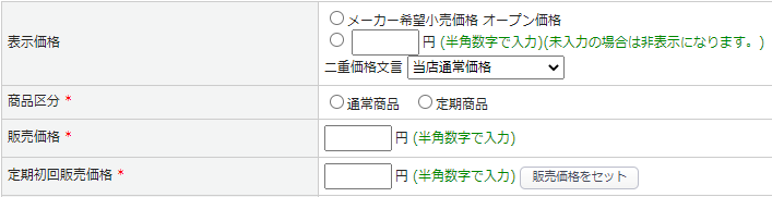 ※ファイルは「商品データ」、項目は「表示価格」、「販売価格」、「初回定期販売価格」です。