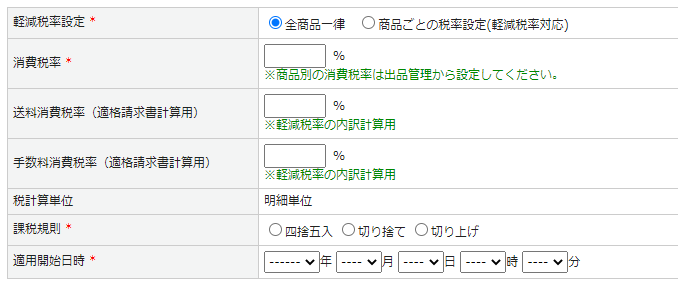 | 軽減税率設定 | 税率設定の適用範囲を指定します。 ・全商品一律:税率設定で設定された消費税率を全商品に適用 ・商品ごとの税率設定:出品管理にて設定された消費税率を適用 ※出品商品にて未設定の場合は税率設定の内容が適用 |