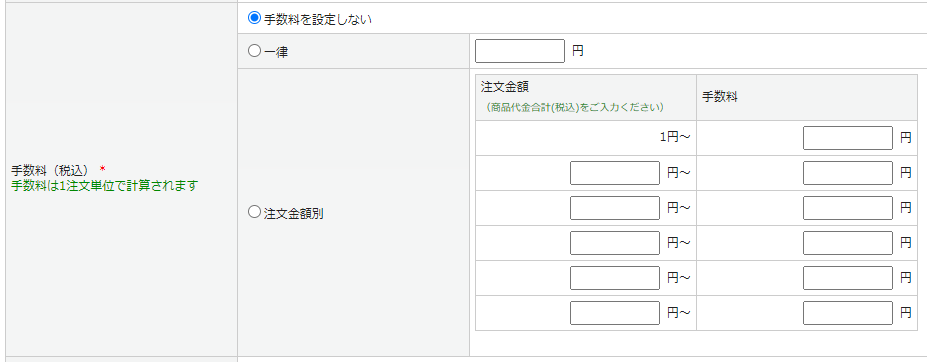 基本設定>配送方法設定 各配送方法の配送料