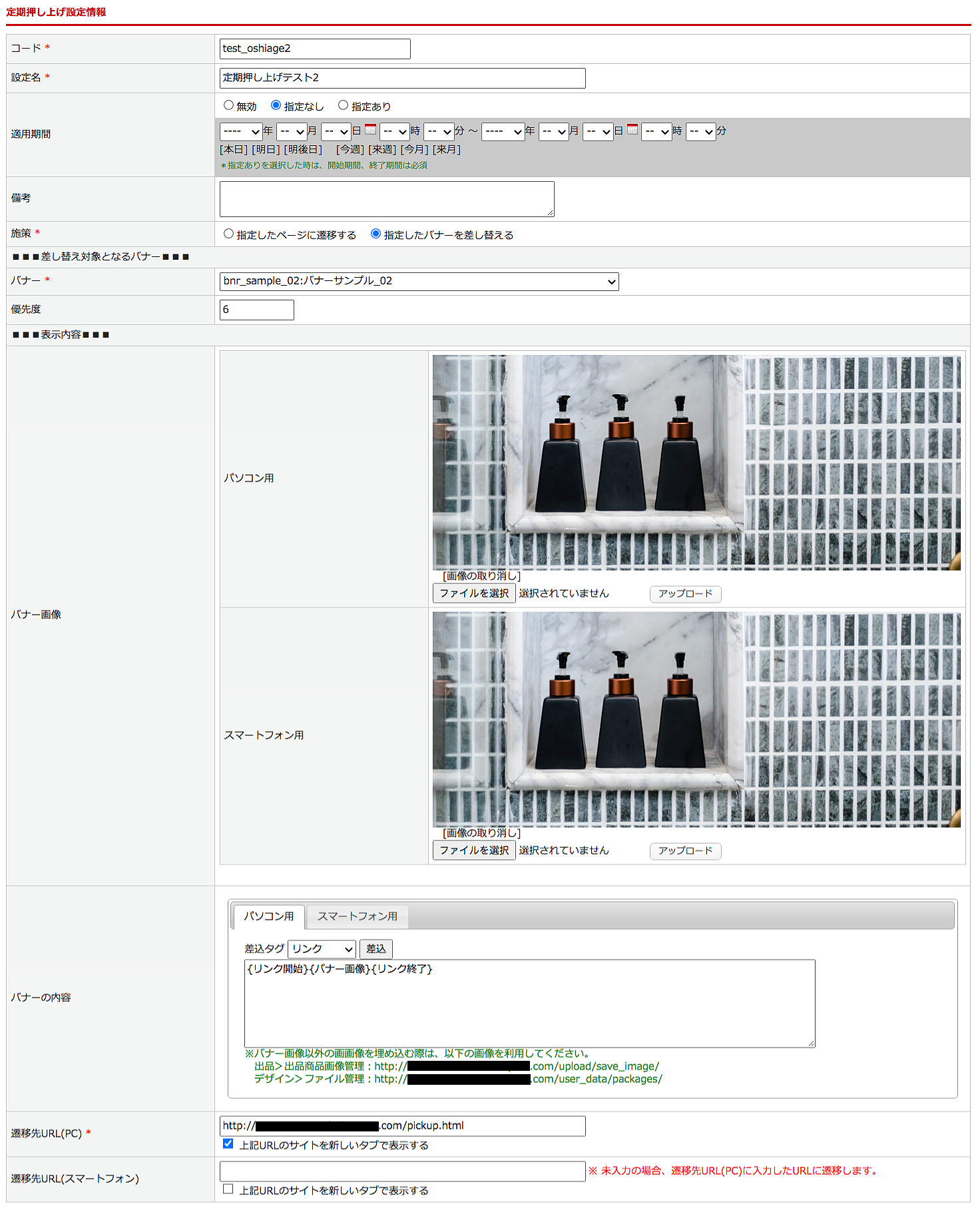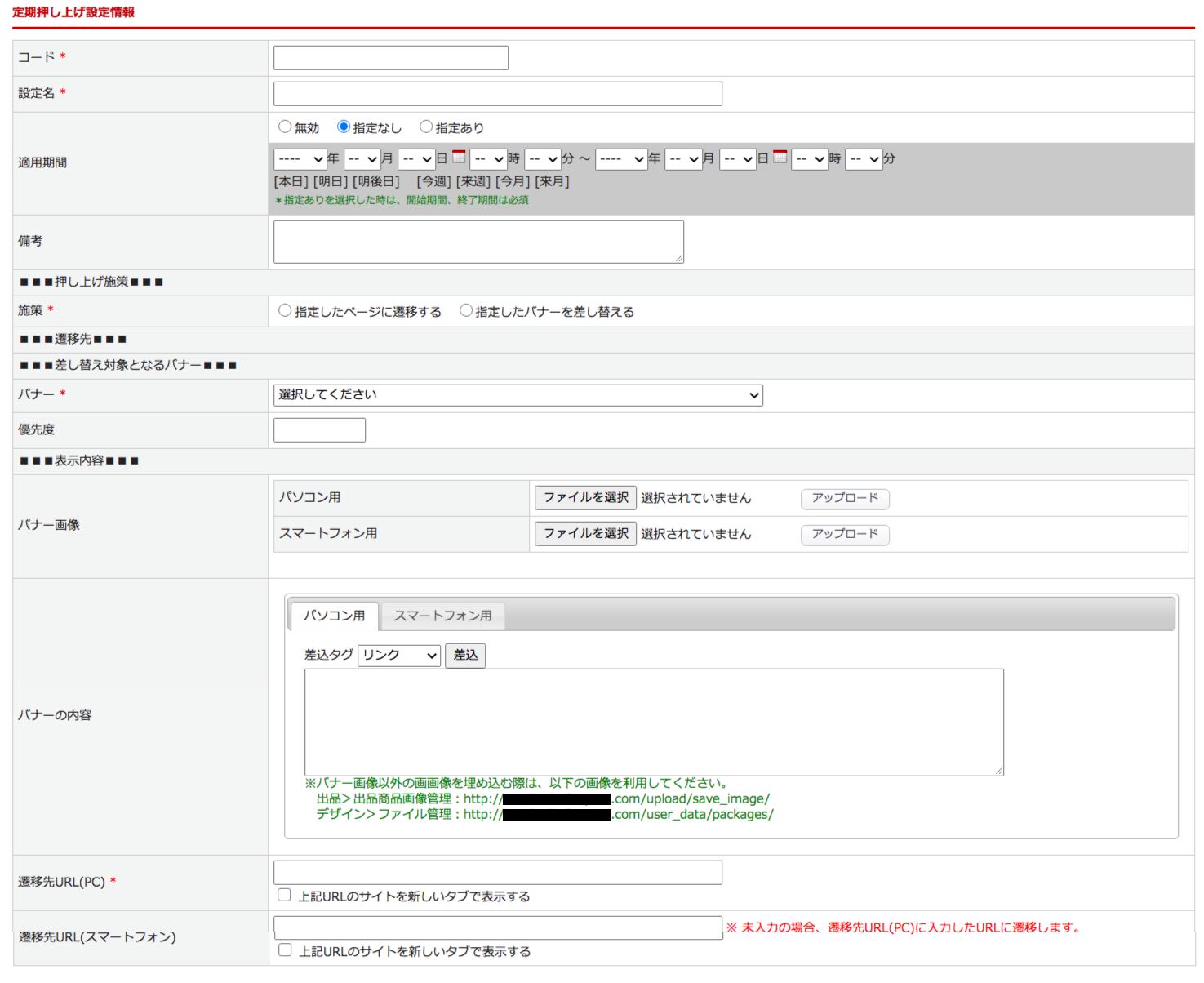 「バナー内容」で{リンク開始}{リンク終了}を差し込まれた場合の遷移先URLを指定します。