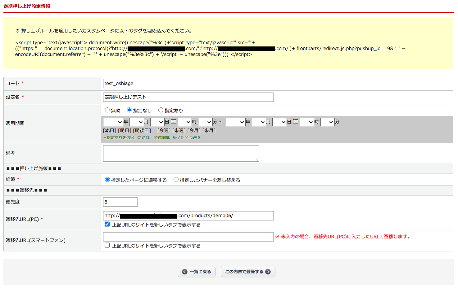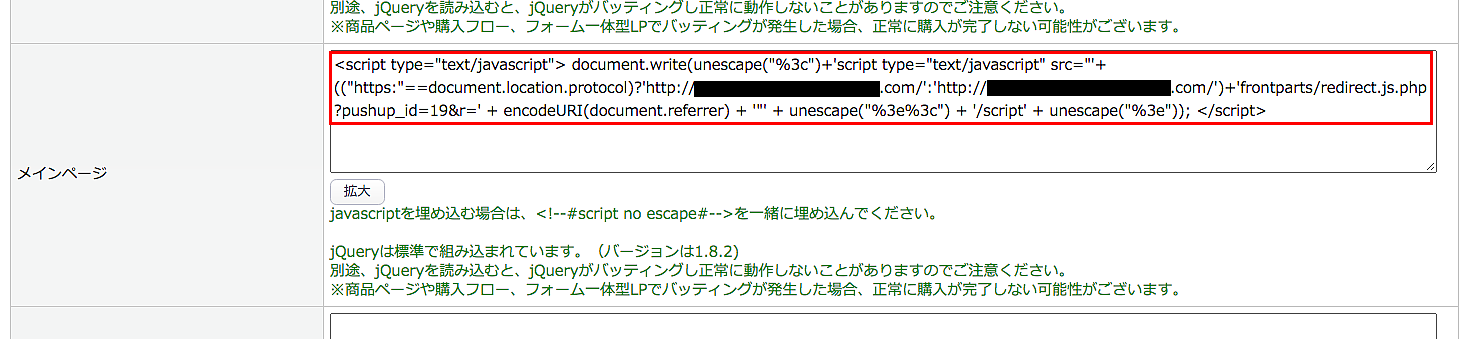 <script type="text/javascript"> document.write(unescape("%3c")+'script type="text/javascript" src="'+(("https:"==document.location.protocol)?'http://ドメイン名/':'http://ドメイン名/')+'frontparts/redirect.js.php?pushup_id=19&r=' + encodeURI(document.referrer) + '"' + unescape("%3e%3c") + '/script' + unescape("%3e")); </script>