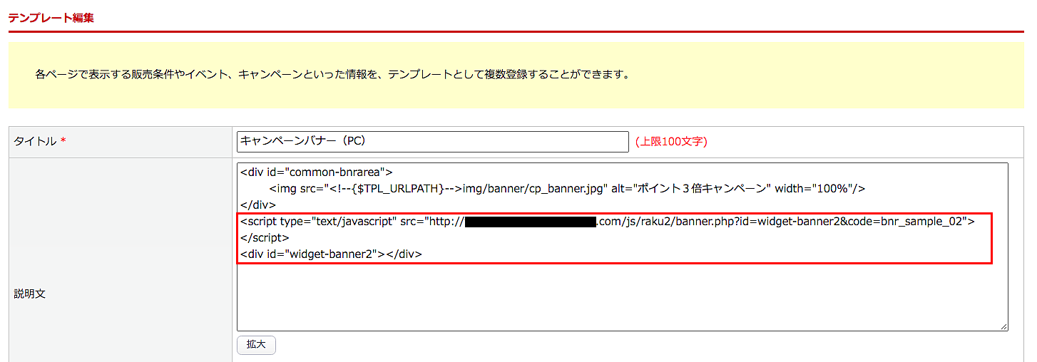 ※直接URLを指定する場合は「<a href=”/plugin/Raku2/plg_raku2_click.php?mode=banner&code=bnr_sample”>{バナー画像}</a>」を埋め込んでください。