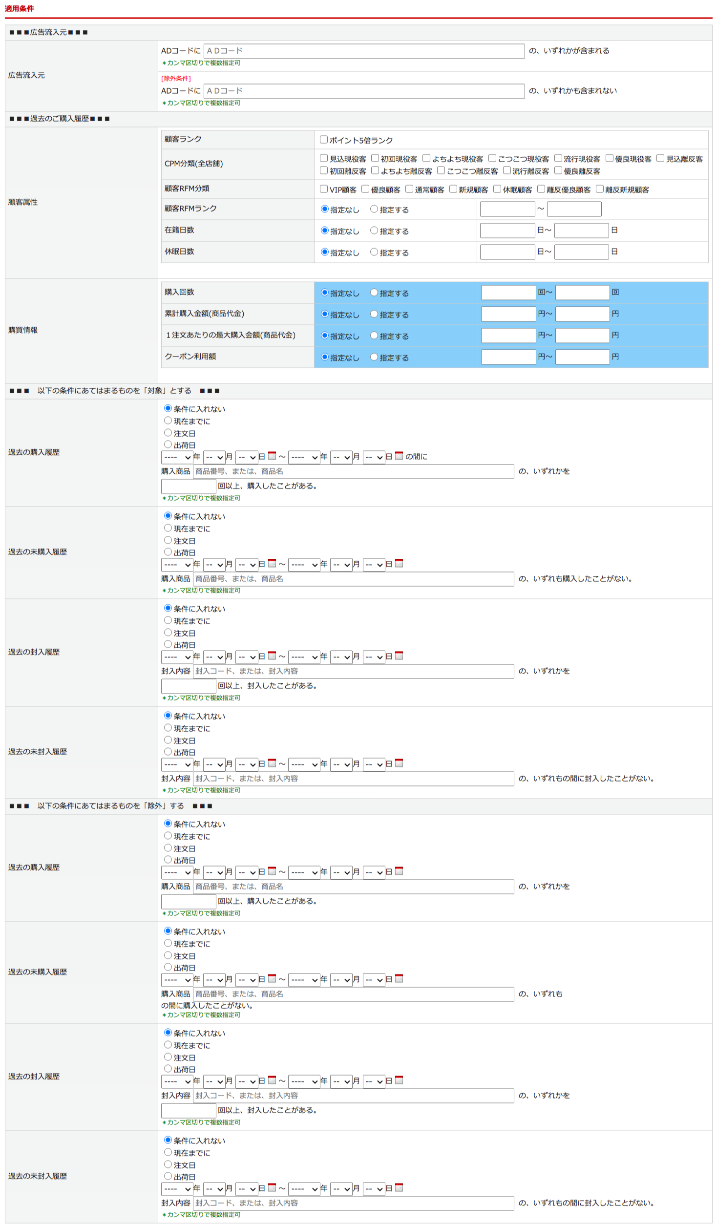 顧客属性 顧客ランク、CPM/RFMなどの属性を指定できます。