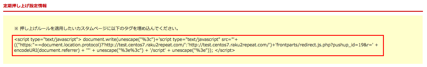 <script type="text/javascript"> document.write(unescape("%3c")+'script type="text/javascript" src="'+(("https:"==document.location.protocol)?'http://ドメイン名/':'http://ドメイン名/')+'frontparts/redirect.js.php?pushup_id=19&r=' + encodeURI(document.referrer) + '"' + unescape("%3e%3c") + '/script' + unescape("%3e")); </script>