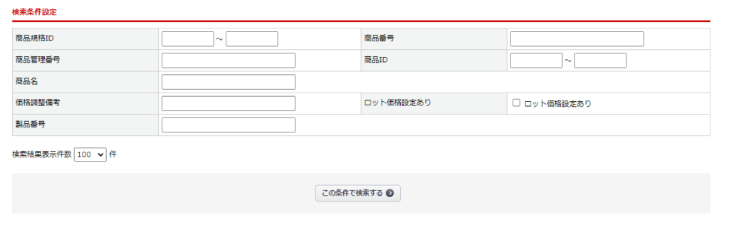 | 商品管理番号 | 検索対象となる商品の「商品管理番号」を指定します。 |