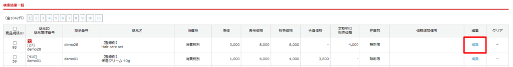 検索結果一覧に表示される対象商品の【編集】ボタンより編集が可能です。