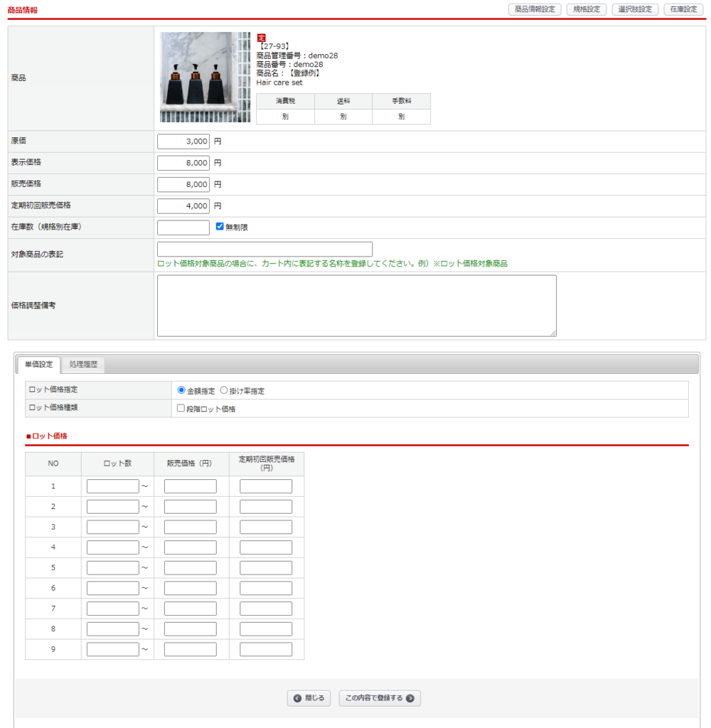 | ロット価格指定 | ロット価格の指定方法を指定してください。 ・金額指定 ロット価格適用時に、指定した価格で販売されます。 ・掛け率指定 ロット価格適用時に、販売価格(定期初回販売価格)に指定した掛け率を適用した価格で販売しまます。 |