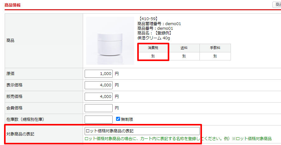 - 出品商品登録の「消費税」を[消費税別]を設定しているときには、ロット価格は税別価格を設定してください。