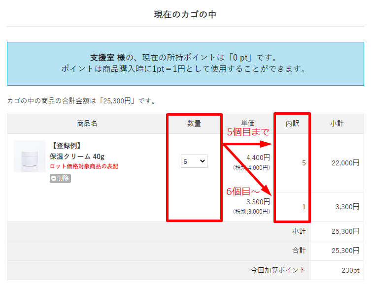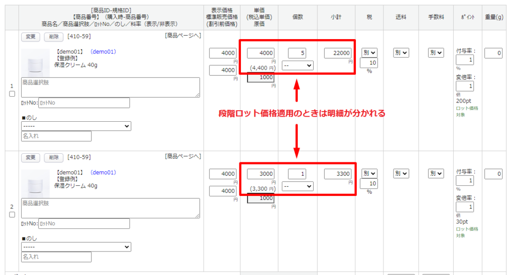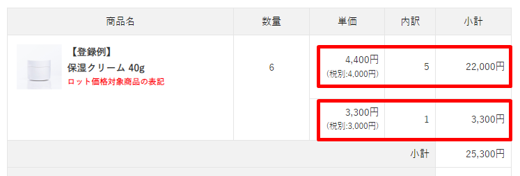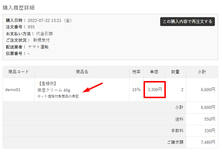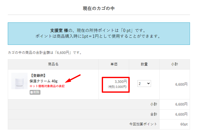 対象商品に設定した表記(ロット価格対象商品の表記)、明細にロット価格が表示されます。