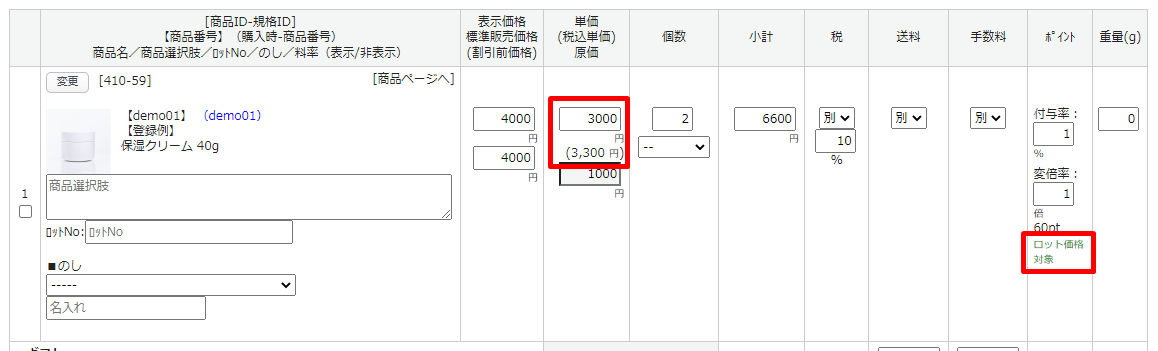 対象商品に設定した表記(ロット価格対象商品の表記)、明細にロット価格が表示されます。