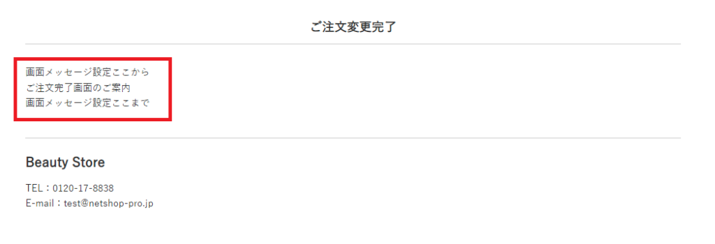 遷移後ページを「ご注文変更確認画面」に設定していた場合、注文完了画面に表示されるリンクをクリックすると、注文変更確認画面へ遷移します。
