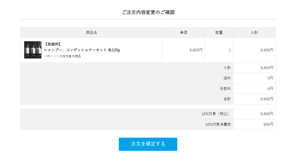 注文変更確認画面への遷移後、【注文を確定する】ボタンをクリックすることで注文内容を変更します。