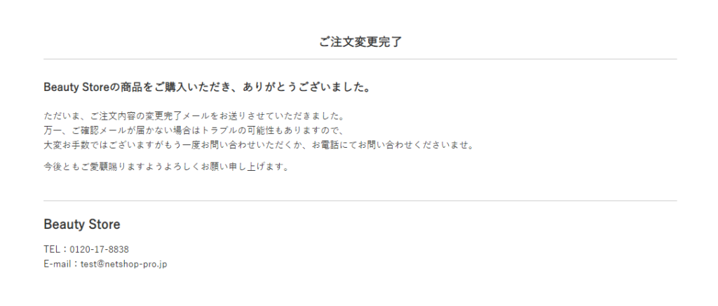 <注文変更完了画面> また、注文変更後に自動送信するサンクスメールのテンプレートを設定します。 |