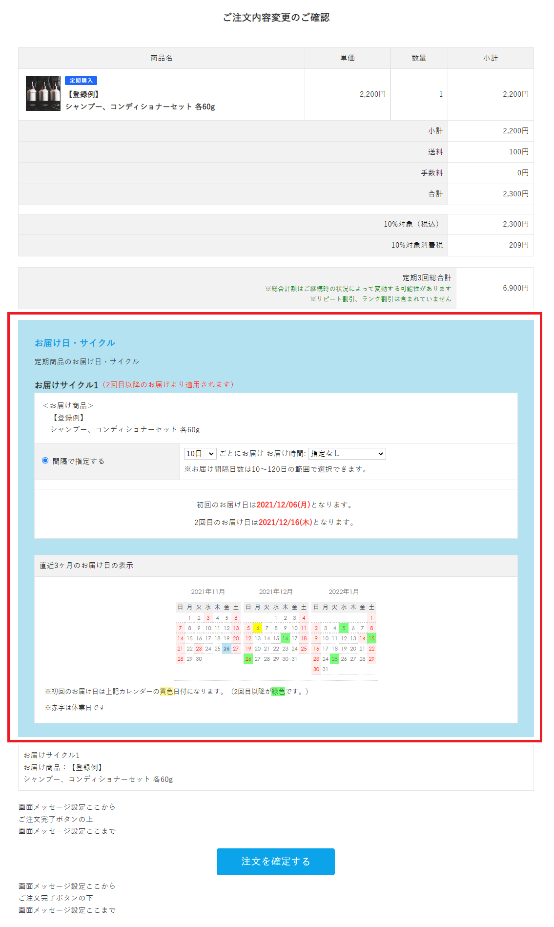 アップセル・クロスセル実行前に選択済みの初回お届け日と注文内容変更確認画面にて再選択したお届けサイクルにより、次回お届け日が再計算されます。
