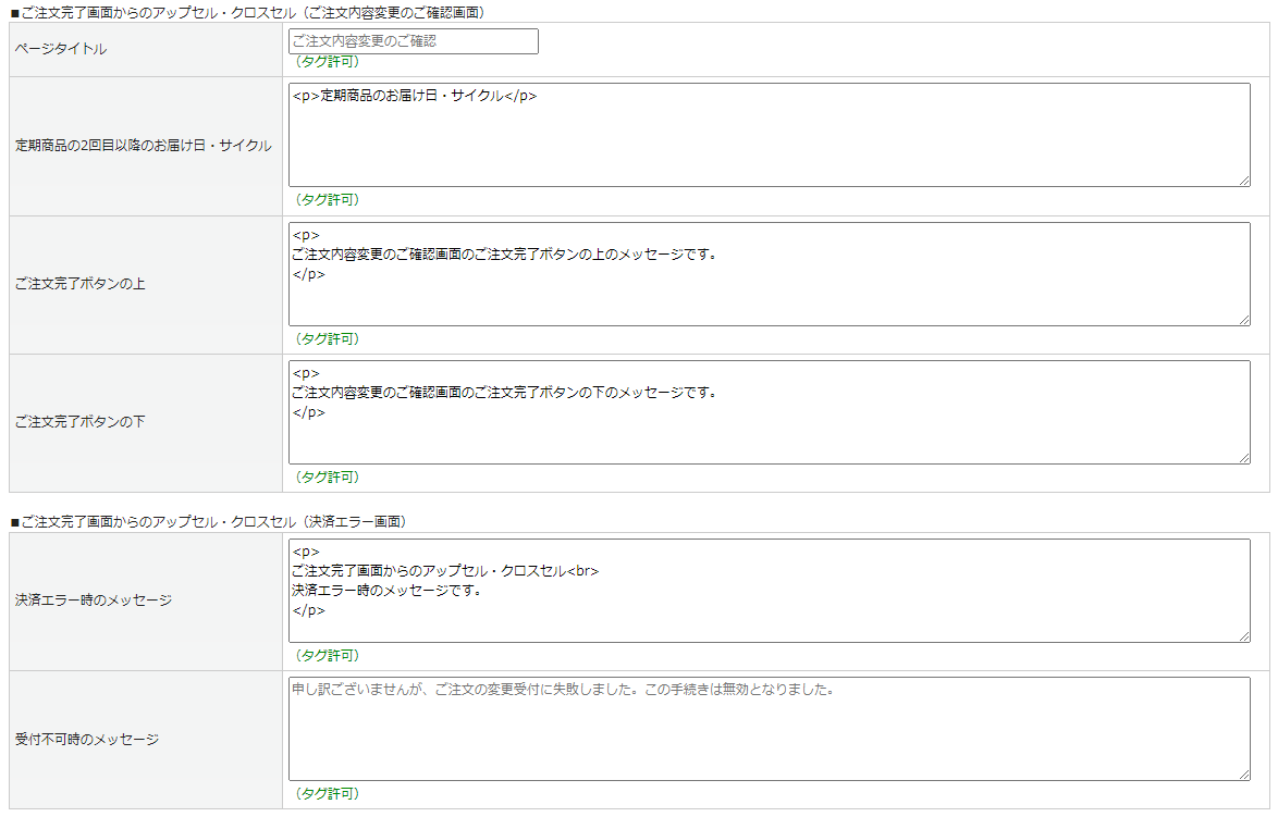 注文完了後アップセル・クロスセル適用時の、「注文変更確認画面」、「決済エラー画面」、「注文変更完了画面」に表示する画面メッセージを設定します。