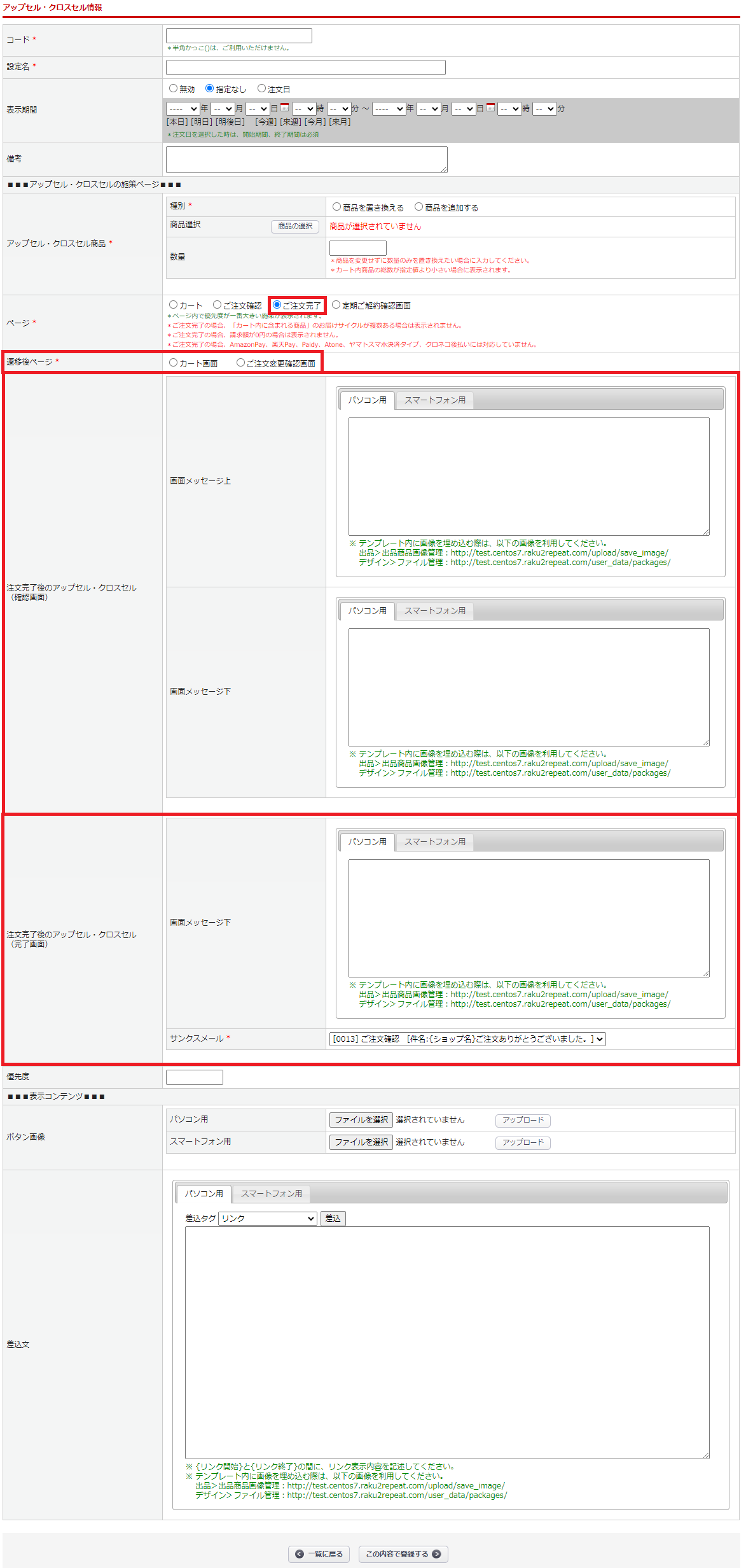 | 遷移後ページ* | 注文完了画面からアップセル・クロスセルを行った場合の、遷移後ページを選択します。 注文完了後に注文内容を変更したい場合は、「ご注文変更確認画面」を選択してください。