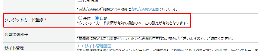 また、”支払方法”でクレジットカードを設定する場合は、基本設定>店舗設定>「決済モジュール設定」タブ で、設定した支払方法のカード登録を「自動」に設定してください。