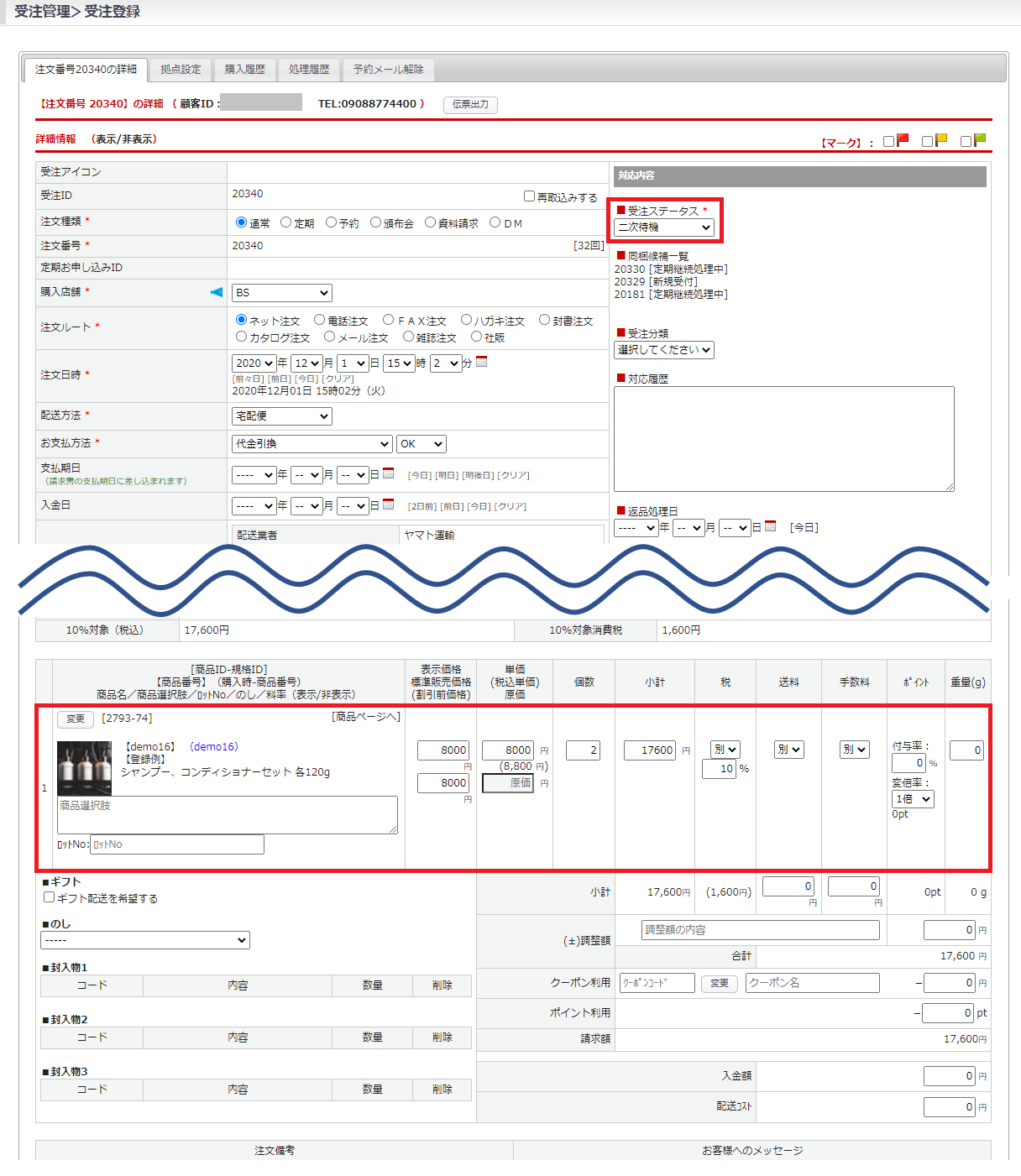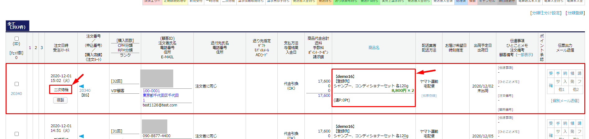 注文完了後アップセル・クロスセル適用後の受注ステータス…”二次待機”