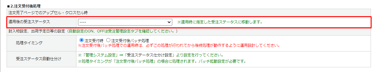 注文完了後アップセル・クロスセル適用後の受注ステータス移動先を設定してください。