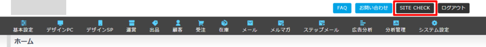 管理画面右上の【SITE CHECK】ボタンをクリックすることで、ショップのフロントページを見ることができます。