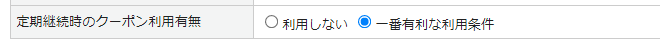 基本設定>カートシステム設定>[定期購入設定]タブ データ作成オプション:「定期継続時のクーポン利用有無」を[一番有利な利用条件]に設定します。