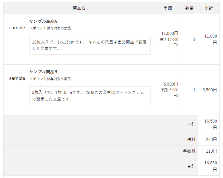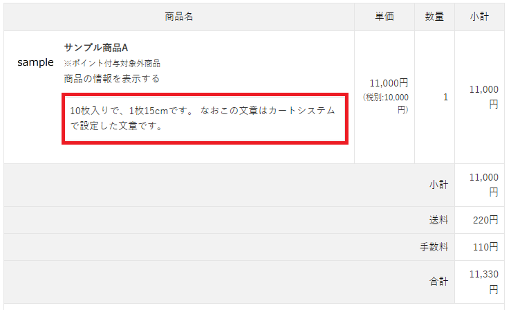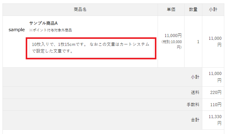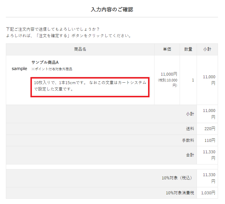 [表示する]に設定した場合には、項目「確認画面 商品詳細メッセージ」で設定した内容が表示されます。