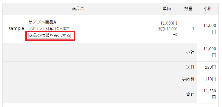 商品詳細メッセージがアコーディオンで表示されます。ボタンをクリックすると商品詳細メッセージが表示されます。