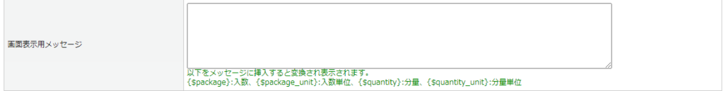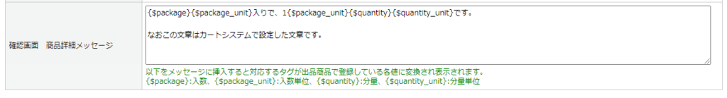 | {$package_unit} | 商品の入数単位(個、袋など) ※出品商品登録画面にて設定可能 |