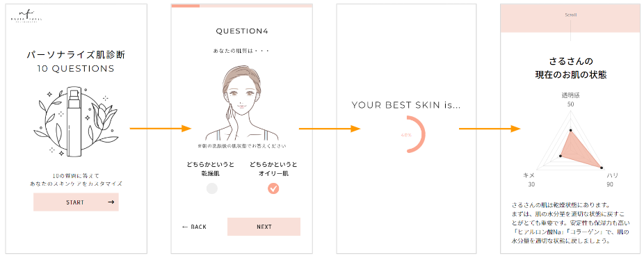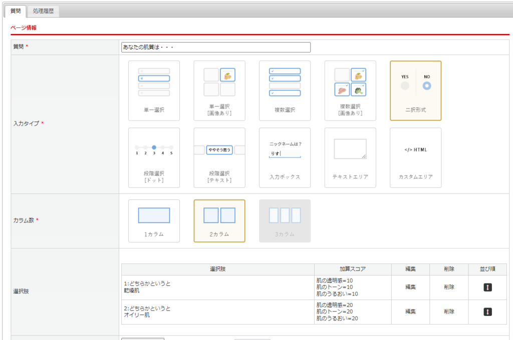 - 質問ページを登録するとき質問の回答に応じて各「スコア」の加算(符号利用可)数を指定します。