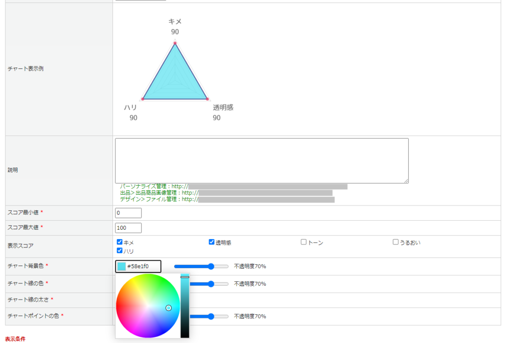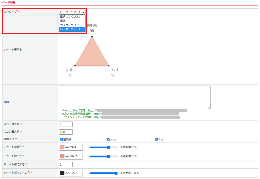 - 完了ページを登録するとき「入力タイプ」について[レーダーチャート]を選択することで、スコアリング結果よりレーダーチャートを表示させることができます。