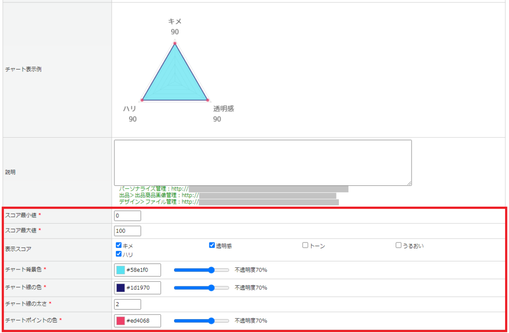 - チャートのデザイン(色味やスコアの最小/最大値など)は、ノーコードで簡単に変更が可能です。