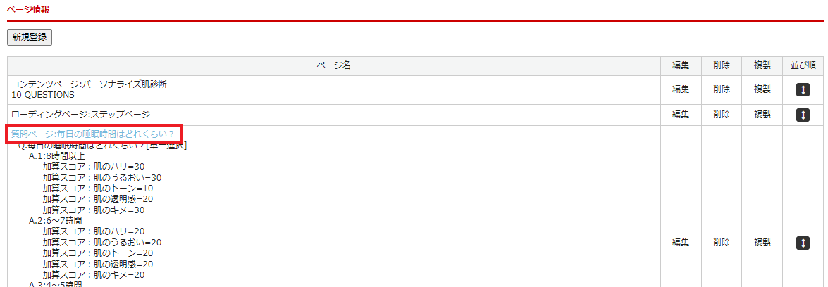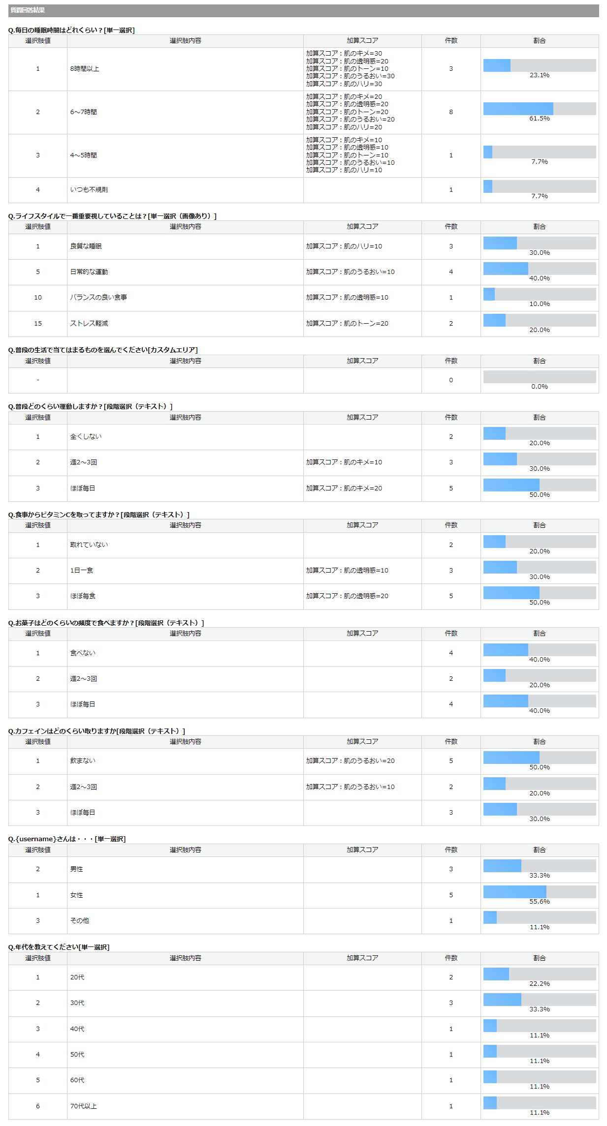| 回答済みの質問 | 選択肢値と選択肢名、それに対するスコア属性とスコア値を表示します。 |