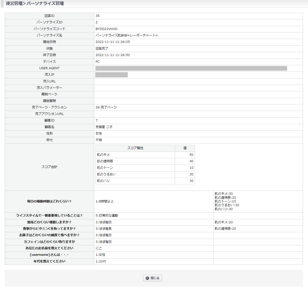| 顧客名 | 回答した顧客名を表示します。 顧客登録されていない場合は、「identification:自動で割振られたID」 |