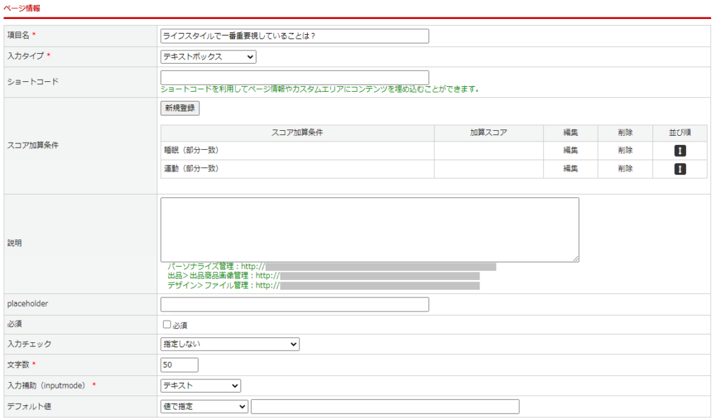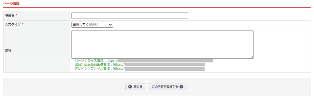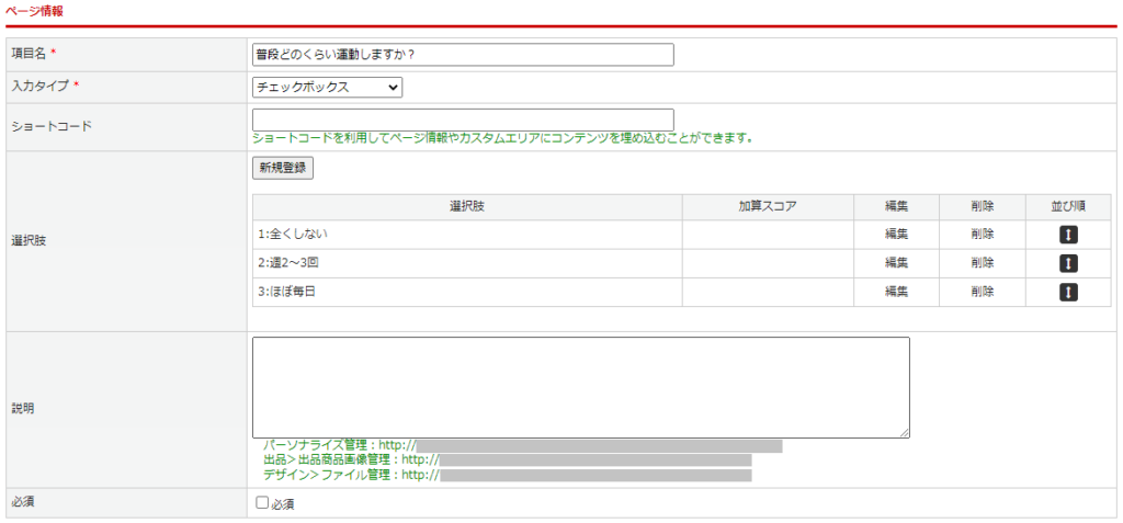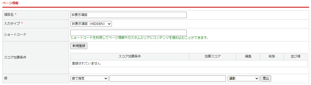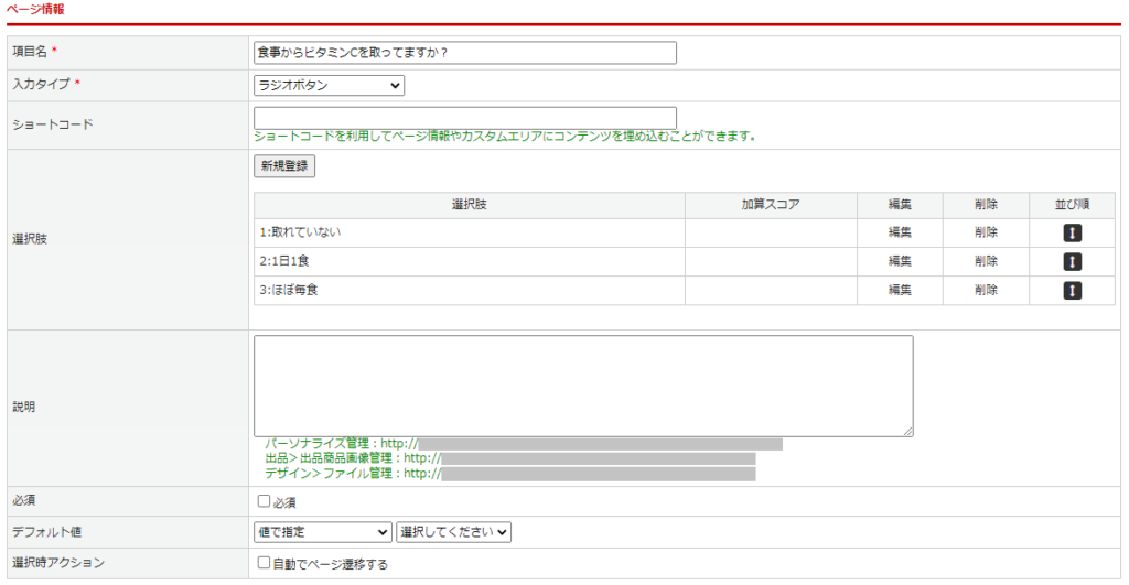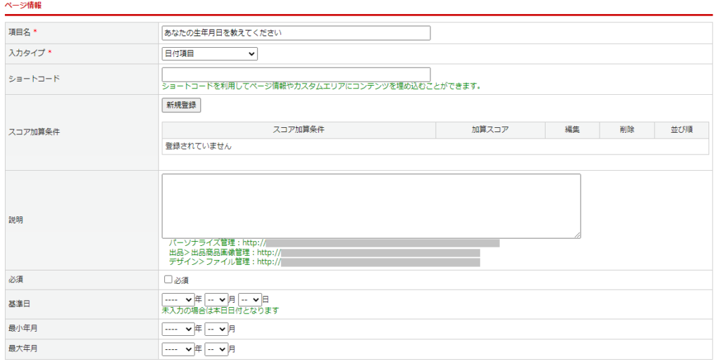 ページ情報のページ種類が[フォームページ]のとき、フォーム項目の【新規登録】ボタンより表示される画面です。セレクトボックスや日付項目の質問を設定することができます。