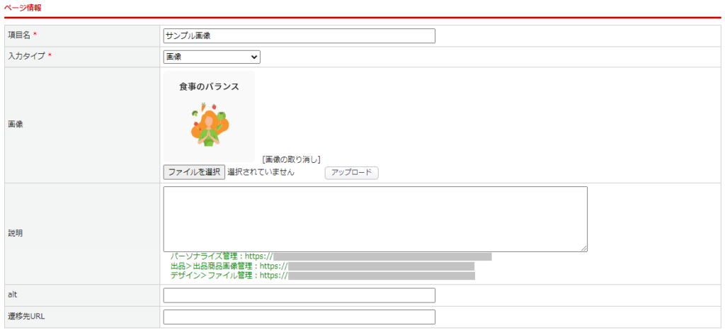画像 【ファイルを選択】ボタンで表示させたい画像を選択し、【アップロード】ボタンで画像をアップロードします。