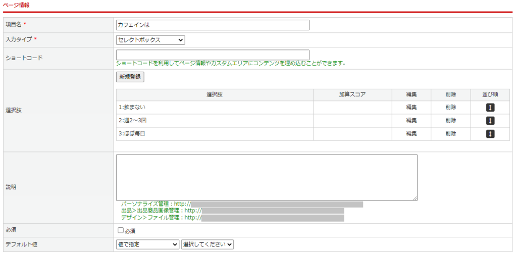デフォルト値 選択肢で設定した値のうちデフォルトで選択済みとする値を設定します。