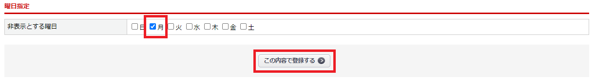 1.非表示とする曜日にチェックをいれて、【この内容で登録する】ボタンをクリックします。