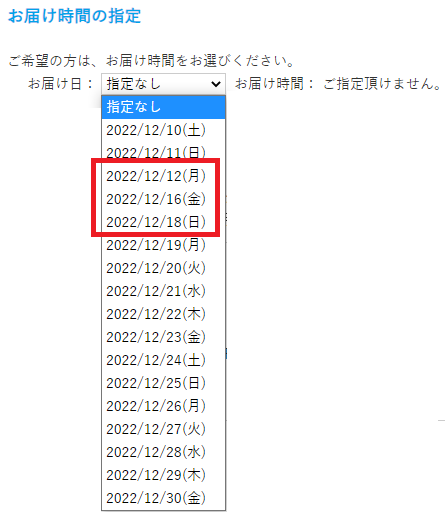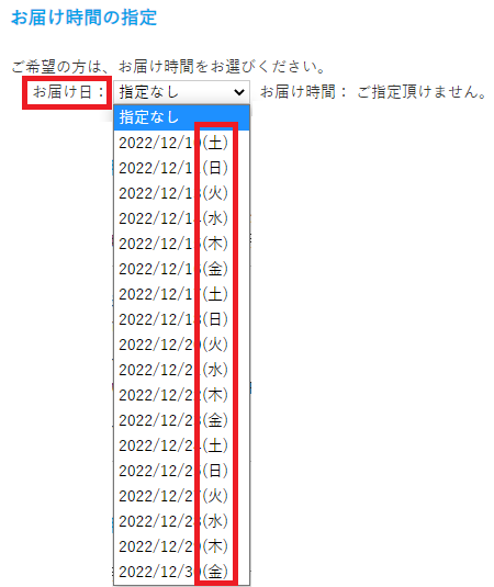 購入フロー「お支払方法・お届け時間等の選択」画面内のお届け日プルダウンにて非表示とする日付を設定できます。