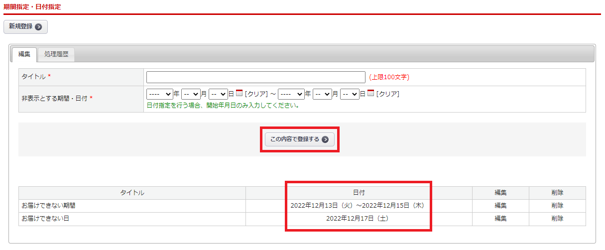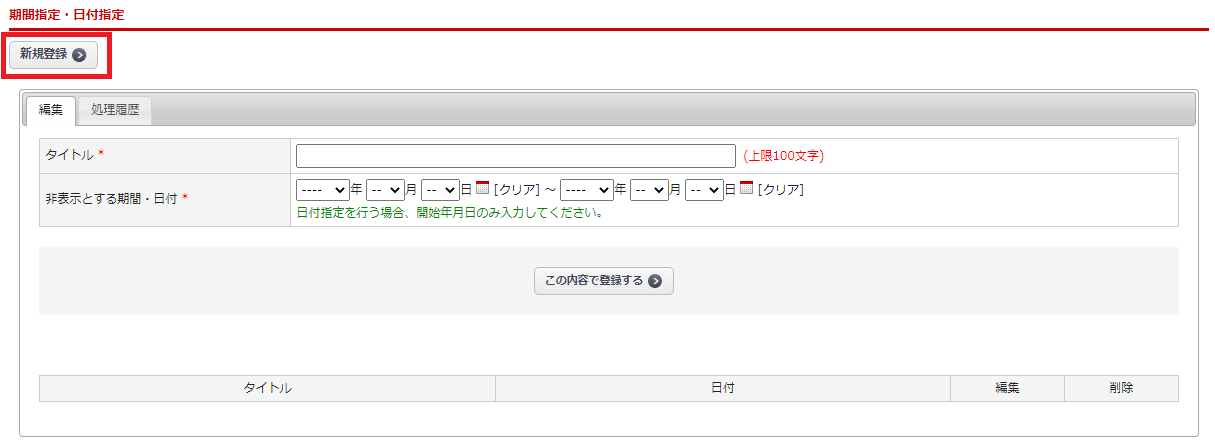 2.タイトル、非表示とする期間・日付を設定し、【この内容で登録する】ボタンをクリックします。