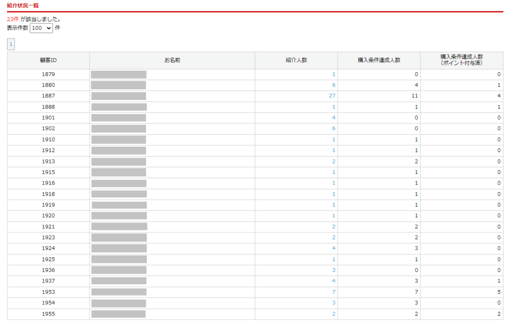 該当キャンペーンで顧客が紹介した人数、購入条件を達成した人数、購入条件を達成しポイントが付与された人数が確認できす。