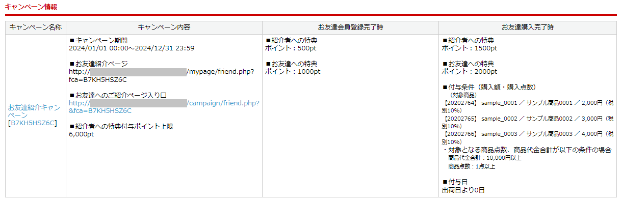 | キャンペーン内容 | キャンペーンの期間、お友達紹介ページのURL、お友達へのご紹介ページ入り口へのURL、紹介者への特典付与ポイント上限が表示されます。 お友達へのご紹介ページ入り口へのURLをクリックすると、お友達へのご紹介ページ入り口が開きます。 |