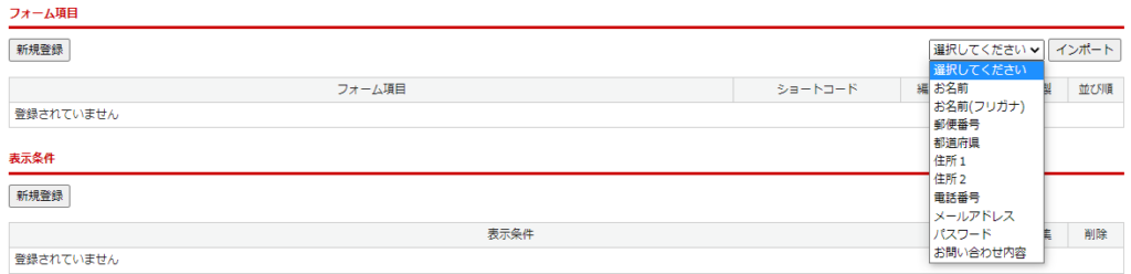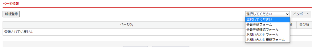 ページ情報、右端のプルダウンの[会員登録フォーム]、[会員登録確認フォーム]、[お問い合わせフォーム]、[お問い合わせ確認フォーム]から作成したいフォームを選択し、【インポート】ボタンをクリックすることで、会員登録フォームなどのページを作成することができます。