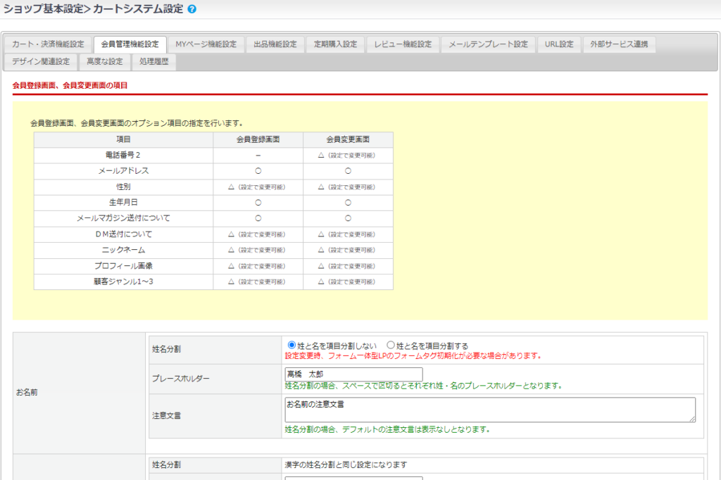 基本設定>カートシステム設定>[会員管理機能設定]タブ
