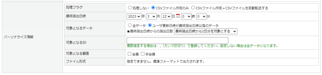 基本設定>管理システム設定>[データエクスポート設定]タブでエクスポートする条件を設定します。