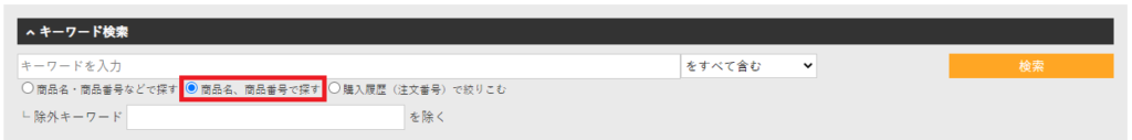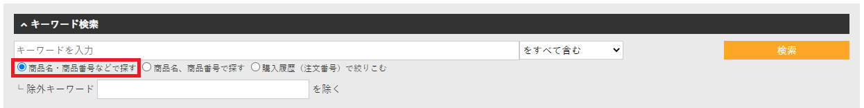 「商品名・商品番号などで探す」を選択し検索した場合と「商品名、商品番号で探す」を選択し検索した場合では検索結果が異なります。「など」が入るとキャッチコピー、PC・スマートフォン用商品説明文、PC・スマートフォン用販売説明文が検索対象として含まれます。