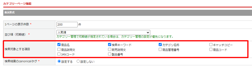 ※検索対象とする項目を変更後、各出品商品を再保存することで各出品商品の検索対象項目が再設定されます。
