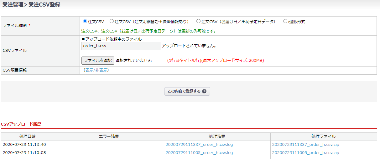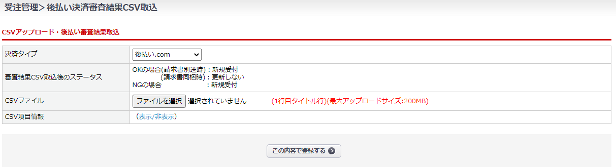 各後払い決済の管理画面からダウンロードした審査結果をCSVで取り込むことができます。