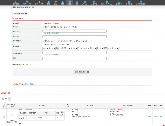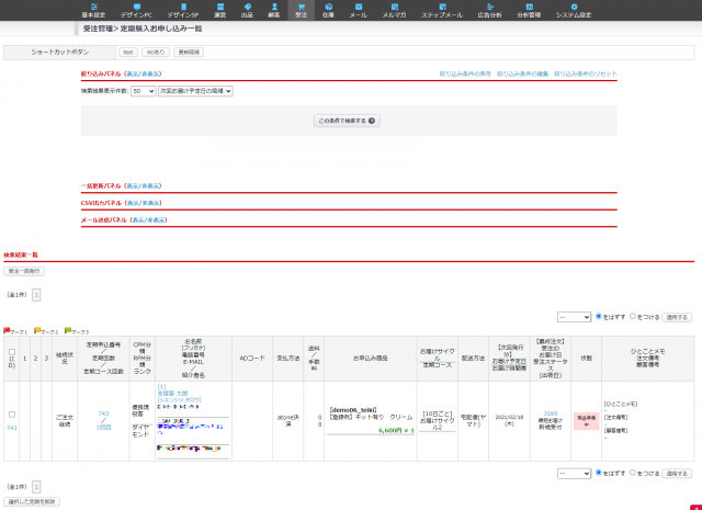 メール送信パネル、検索結果一覧等の機能により受注データの管理を行います。
