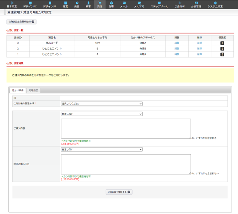 受注ステータスとは異なる軸で受注データを分類できる受注分類を設定する画面です。